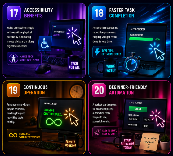 Auto clickers assist users who may have difficulty performing repetitive physical actions. They make digital tools more accessible and inclusive. This meaningful advantage is among the top reasons Auto Clickers are gaining attention.